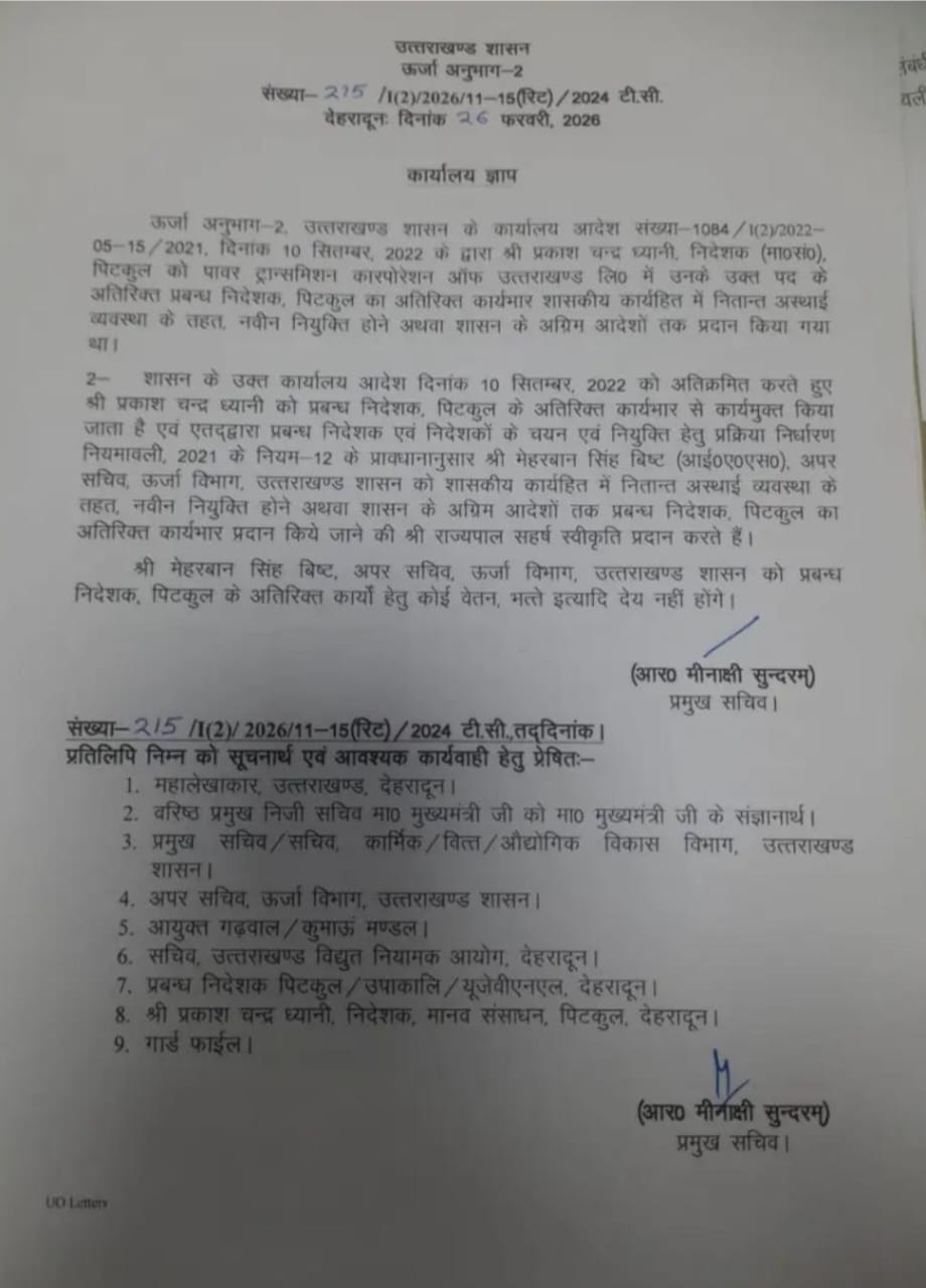शासन में पावर ट्रान्समिशन कारपोरेशन ऑफ उत्तराखण्ड लिमिटेड (पिटकुल) के प्रभारी प्रबन्ध निदेशक पीसी ध्यानी को कार्यमुक्त कर दिया है। अपर सचिव, ऊर्जा मेहरबान सिंह बिष्ट को शासकीय कार्यहित में नितान्त अस्थाई व्यवस्था के तहत नई नियुक्ति होने अथवा शासन के अग्रिम आदेशों तक प्रबन्ध निदेशक, पिटकुल का अतिरिक्त कार्यभार सौंपा गया है कांग्रेस की ओर से जारी की गई विज्ञप्ति, कांग्रेस प्रवक्ता सुजाता पाल, कांग्रेस प्रवक्ता एडवोकेट पंकज क्षेत्री जन प्रहार (भ्रष्टाचार और कुशासन पर जनता का वार उच्च न्यायालय की सख्ती और जन प्रहार के आंदोलन का असर — एमडी पिटकुल प्रकाश चंद्र ध्यानी को हटाया गया जन प्रहार संगठन यह स्पष्ट रूप से मानता है कि पिटकुल के बहुचर्चित प्रबंध निदेशक श्री प्रकाश चंद्र ध्यानी को पद से हटाया जाना उत्तराखंड उच्च न्यायालय की सख्त टिप्पणियों एवं आदेशों तथा जन प्रहार द्वारा चलाए गए सतत जनआंदोलन का प्रत्यक्ष परिणाम है जब उच्च न्यायालय के आदेशों की अवहेलना करते हुए सरकार द्वारा नियमों में परिवर्तन कर पद पर बनाए रखने का प्रयास किया गया, तब जन प्रहार ने इसे न्यायालय की अवमानना एवं पारदर्शिता के विरुद्ध कदम बताते हुए मुखर विरोध दर्ज कराया। प्रेस वार्ताओं, ज्ञापनों एवं जनजागरण अभियान के माध्यम से इस मुद्दे को प्रदेश की जनता के समक्ष प्रमुखता से उठाया गया जन प्रहार यह श्रेय उत्तराखंड उच्च न्यायालय की निष्पक्ष न्यायिक व्यवस्था को देता है, जिसने कानून की गरिमा को सर्वोपरि रखा। साथ ही, यह निर्णय दर्शाता है कि जब जनता संगठित होकर आवाज उठाती है तो सरकार को जनभावनाओं और विधि के शासन के आगे झुकना पड़ता है।