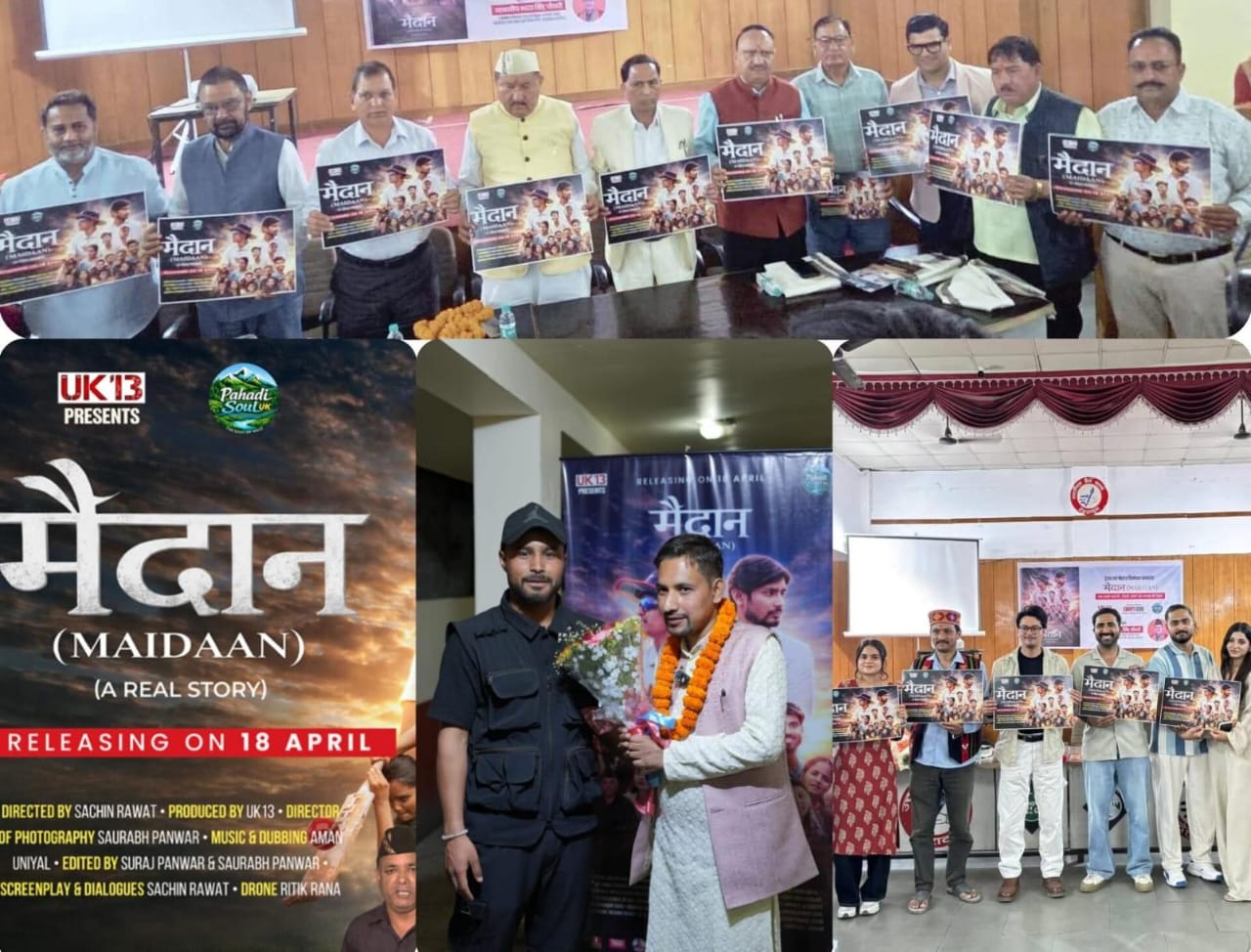 UK13 के कलाकारों ने बनाई सचिन भंडारी पवन बुटोला के संघर्ष पर फिल्म सचिन भंडारी पवन बुटोला देहरादून में चलाते हैं ब्राइट फ्यूचर एकेडमी कैबिनेट मंत्री भरत सिंह चौधरी ने सचिन के हौसले की कि तारीफ बताया संघर्ष करने वाले बहाने नहीं बनाते बल्कि मेहनत कर मुकाम हासिल करते हैं उत्तराखंड के कैबिनेट मंत्री भरत सिंह चौधरी ने देर शाम उत्तरांचल प्रेस क्लब में मैदान फिल्म के पोस्टर और प्रोमो को लांच किया गया इस मौके पर उन्होंने UK 13 कलाकारों की टीम को बधाई देते देहरादून : कैबिनेट मंत्री भरत सिंह चौधरी ने कहा माता-पिता, शिक्षक के बाद दोस्त जीवन मे सुख दुःख से पार पाने में अहम भूमिका निभाता है। जिस तरह से माता-पिता बच्चे का भरण पोषण, शिक्षक उसके भविष्य का निर्माता होता है। इसी तरह दोस्त एक दूसरे के संकट में काम आते है। जिसका प्रत्यक्ष प्रमाण विभिन्न क्षेत्रों में देखने को मिला है।यूके 13 कलाकारों ने भी लघु फ़िल्म का फिल्मांकन इसी तरह किया है। जो दो दोस्त की जीवन गाथा पर आधारित है। फ़िल्म के प्रोमो में देखने को मिला है। जीवन मे संघर्ष जरूरी है। इसके बिना सफलता अधूरा है। फ़िल्म में दो मित्रों की कहानी गांव से लेकर शहर तक दर्शाई गई है। जिसमे फ़िल्म निर्माता ने दोनों मित्रों की सादगी, परिश्रम और ईमानदारी का फ़िल्म में परिचय देने का काम किया है। उन्होंने पूरी टीम को बधाई देने के साथ ही आमजन से फ़िल्म को प्रोत्साहित करने की अपील की, वहीं कार्यक्रम में विशिष्ट अतिथि औषधि पादप बोर्ड के उपाध्यक्ष प्रताप सिंह पंवार ने कहा कि गांव से निकली युवाओं की टीम ने आज अपने हुनर से उत्तराखंड की फीचर फिल्मों में भी कदम बढ़ाया है कार्यक्रम में विशिष्ट अतिथि मैती आंदोलन के जनक पद्मश्री पुरस्कार से सम्मानित कल्याण सिंह रावत ने कहा कि फिल्म एक मनोरंजन का साधन नहीं बल्कि समाज को प्रभावित करने वाली विधा भी है, कार्यक्रम में सोशल पॉलीगों ग्रुप के एमडी डी एस पंवार ने पूरी टीम को बधाई दी और कार्यक्रम में मौजूद सुप्रसिद्ध अभिनेता बलदेव राणा ने फिल्म के पोस्टर और प्रोमो की जमकर तारीफ की और कहा कि यूके 13 कलाकार की टीम अपनी संस्कृति के लिए बेहतरीन काम कर रही है इसी का सफल परिणाम है कि आज यूके 13 के कलाकार उत्तराखंड की फिचर फिल्मों में भी हुनर दिखा रहे हैं, कार्यक्रम में निर्माता निर्देशक देबू रावत और सुनील बडोनी ने भी फिल्म के पोस्टर प्रोमो की जमकर तारीफ की