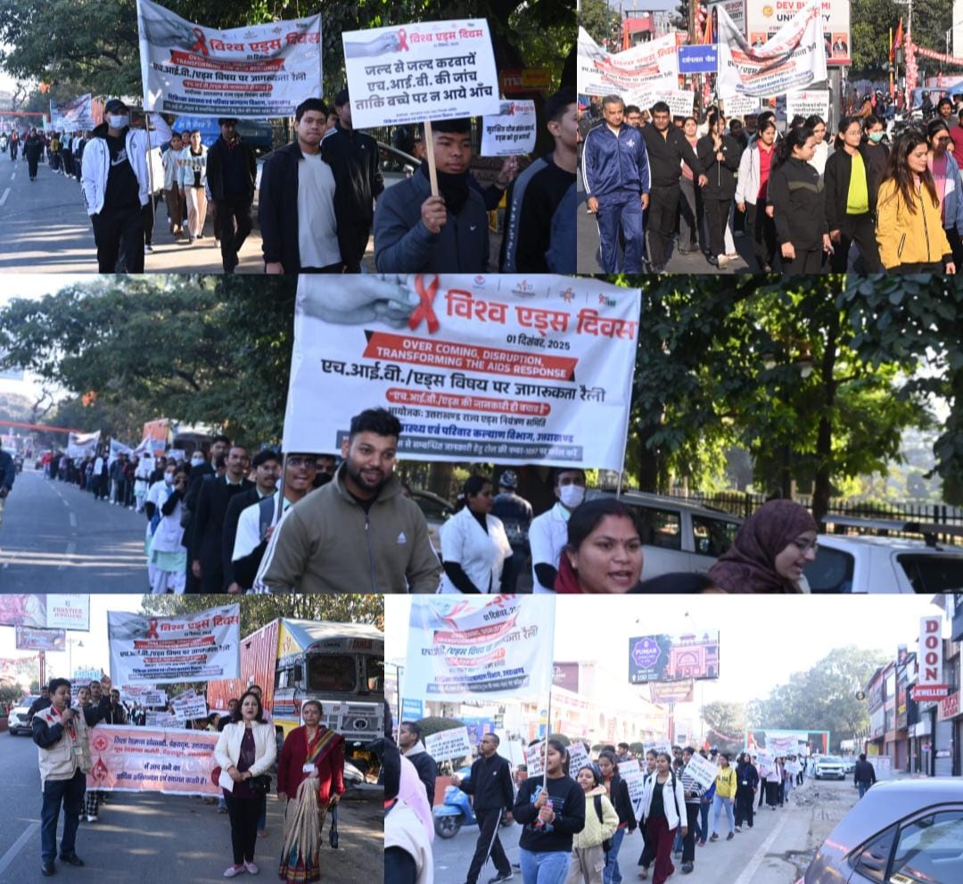 विश्व एड्स दिवस केवल एक वैश्विक स्वास्थ्य दिवस नहीं, बल्कि मानवता के प्रति जिम्मेदारी और समाज के प्रति संवेदनशीलता का प्रतीक है एचआईवी/एड्स जैसी चुनौतीपूर्ण बीमारी के प्रति जागरूकता और रोकथाम के उद्देश्य से उत्तराखंड राज्य एड्स नियंत्रण समिति, स्वास्थ्य विभाग, उत्तराखण्ड सरकार ने 1 दिसम्बर 2025 को राजधानी देहरादून में भव्य राज्य स्तरीय जागरूकता रैली का आयोजन किया। इस रैली के माध्यम से समाज के हर वर्ग तक यह संदेश देने का प्रयास किया गया कि एचआईवी से बचाव का सबसे प्रभावी उपाय है सही जानकारी और समय पर जांच इस वर्ष विश्व एड्स दिवस के लिए नाको, भारत सरकार ने “Overcoming Disruption, Transforming the AIDS Response” की थीम दी, जो पिछले वर्षों की चुनौतियों को पीछे छोड़ते हुए एड्स नियंत्रण प्रयासों को और सुदृढ़ करने पर केंद्रित है। इसी थीम के संदेश को समाज तक प्रभावी रूप से पहुंचाने के लिए गांधी पार्क, देहरादून से विशाल जागरूकता रैली का शुभारंभ हुआ। अपर परियोजना निदेशक डॉ. अमित शुक्ला, उप निदेशक (वित्त) महेंद्र कुमार, इंडियन रेडक्रॉस सोसायटी एवं यूथ रेडक्रॉस समिति से डाॅ. अनिल वर्मा, तथा संयु (IEC अनिल सती ने संयुक्त रूप से हरी झंडी दिखाकर रैली को रवाना किया