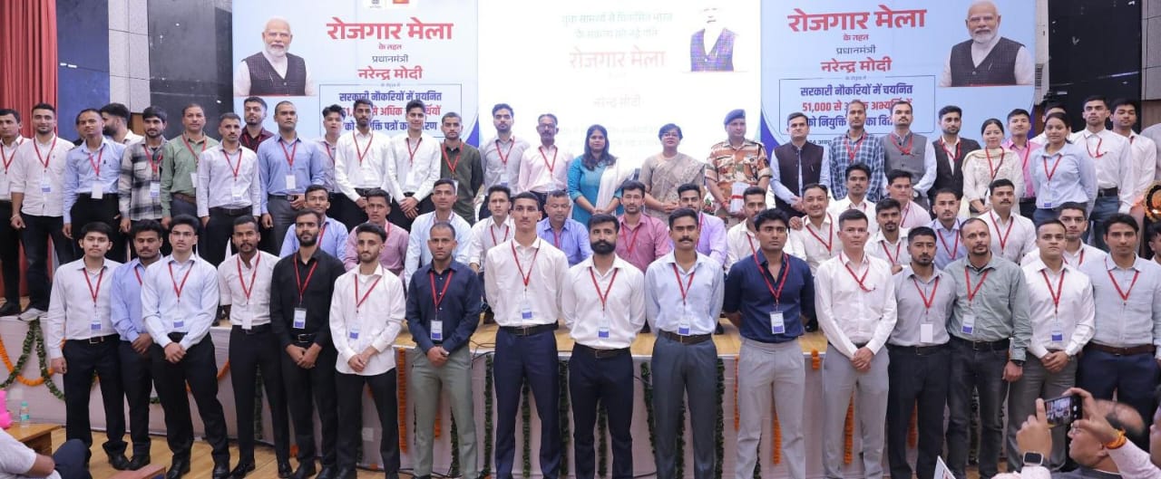 रोजगार मेले के तहत प्रधानमंत्री नरेंद्र मोदी के नेतृत्व में शुक्रवार को सरकारी विभागों और संगठनों में भर्ती हुए नवनियुक्त भर्तियों को लगभग 51,000 नियुक्ति पत्र जारी किये गए। प्रधानमंत्री नरेन्द्र मोदी के नेतृत्व में वर्चुवल माध्यम से आज शुक्रवार को देश भर के 40 विभिन्न स्थानों पर लगभग 51,000 नव नियुक्तो को नियुक्ति पत्र जारी किये गए इसी क्रम में उत्तराखण्ड में देहरादून स्थित सर्वे ऑफ़ इंडिया के ऑडिटोरियम में रोजगार मेले का आयोजन किया गया जिसमें उत्तराखण्ड डाक परिमण्डल की मुख्य पोस्टमास्टर जनरल शशि शालिनी कुजूर मुख्य अतिथि के रूप में शामिल हुई । इस अवसर पर उत्तराखण्ड डाक विभाग में नियुक्त 59 डाक सहायको एवं डाक सेवकों के अतिरिक्त रेलवे के 14 , केंद्रीय सशस्त्र पुलिस बल के 81, स्टेट बैंक ऑफ़ इंडिया के 19, टिहरी हाइड्रो डेवलपमेंट कारपोरेशन लिमिटेड के 41 एवं आईआईएम सिरमौर के 01 सहित 215 नव नियुक्त युवाओ को नियुक्ति पत्र वितरित किये गए।