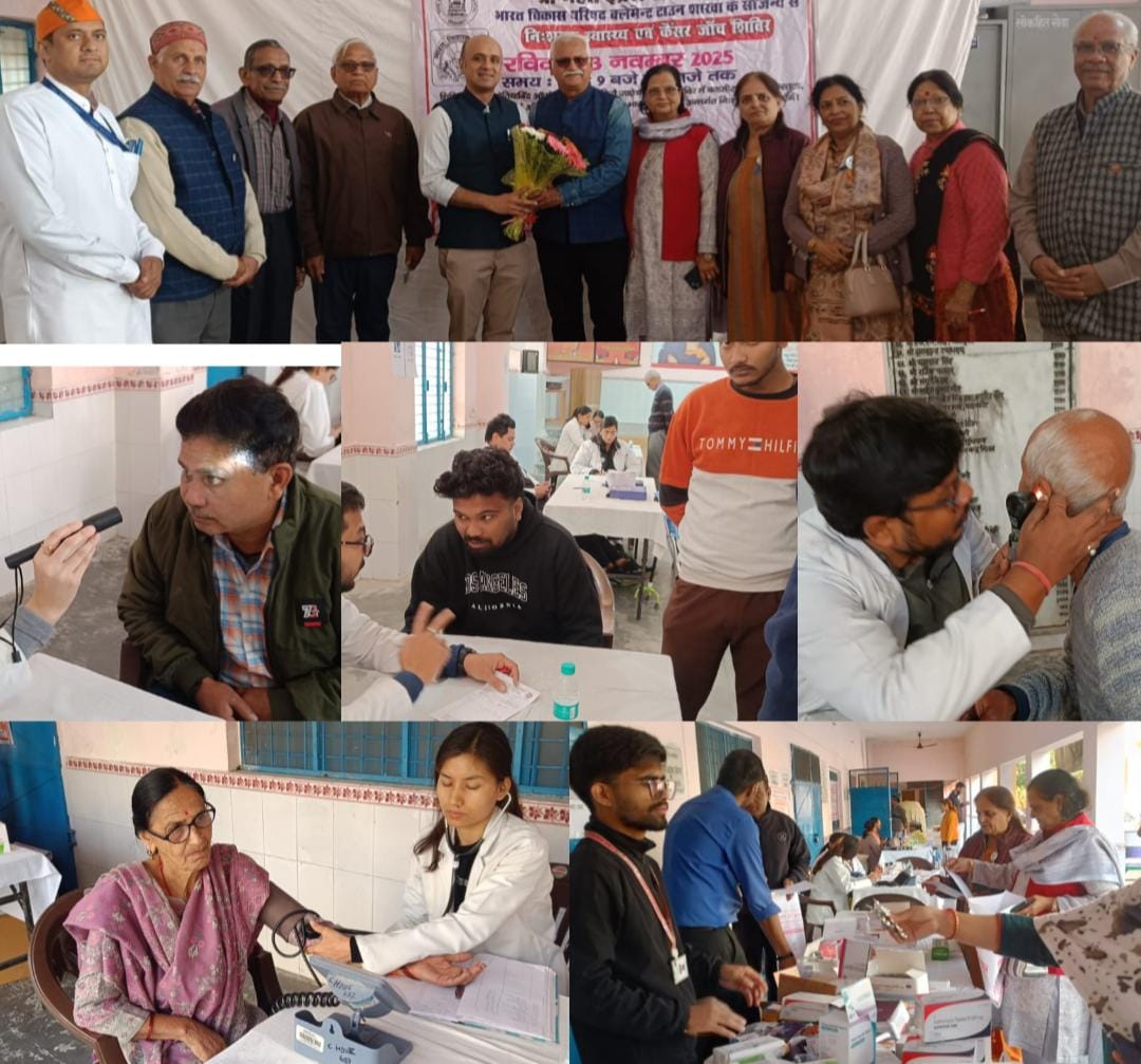 मूल्यवान पूँजी है” का संदेश देते हुए परामर्श एवं दवाइयाँ निःशुल्क प्रदान कीं रविवार को आर्य समाज मंदिर सुभाष नगर में शिविर का शुभारंभ श्री महंत इन्दिरेश अस्पताल के वरिष्ठ कैंसर सर्जन डाॅ. अजीत तिवारी और भारत विकास परिषद के अध्यक्ष दिलीप कुमार शर्मा ने दीप प्रज्वलित कर किया इस अवसर पर दिलीप कुमार शर्मा ने कहा कि श्री महंत इन्दिरेश अस्पताल के माननीय चेयरमैन
