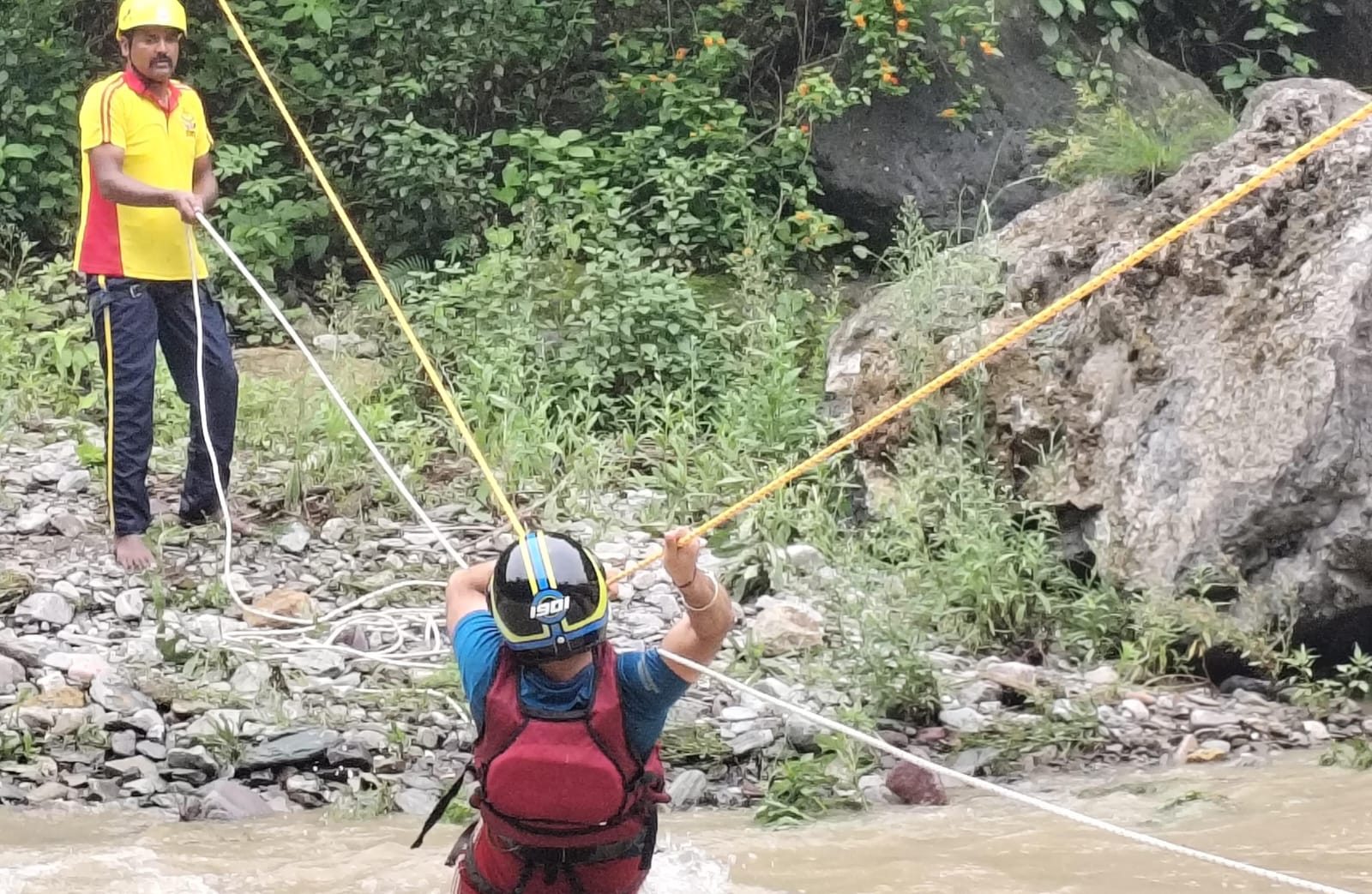 SDRF टीम द्वारा घटनास्थल पर पहुँचकर त्वरित एवं सटीक रेस्क्यू ऑपरेशन चलाया गया। टीम ने रोप रिवर क्रॉसिंग तकनीक का प्रयोग करते हुए तीनों व्यक्तियों को सकुशल नदी पार कराकर सुरक्षित स्थान पर पहुँचाया गया।