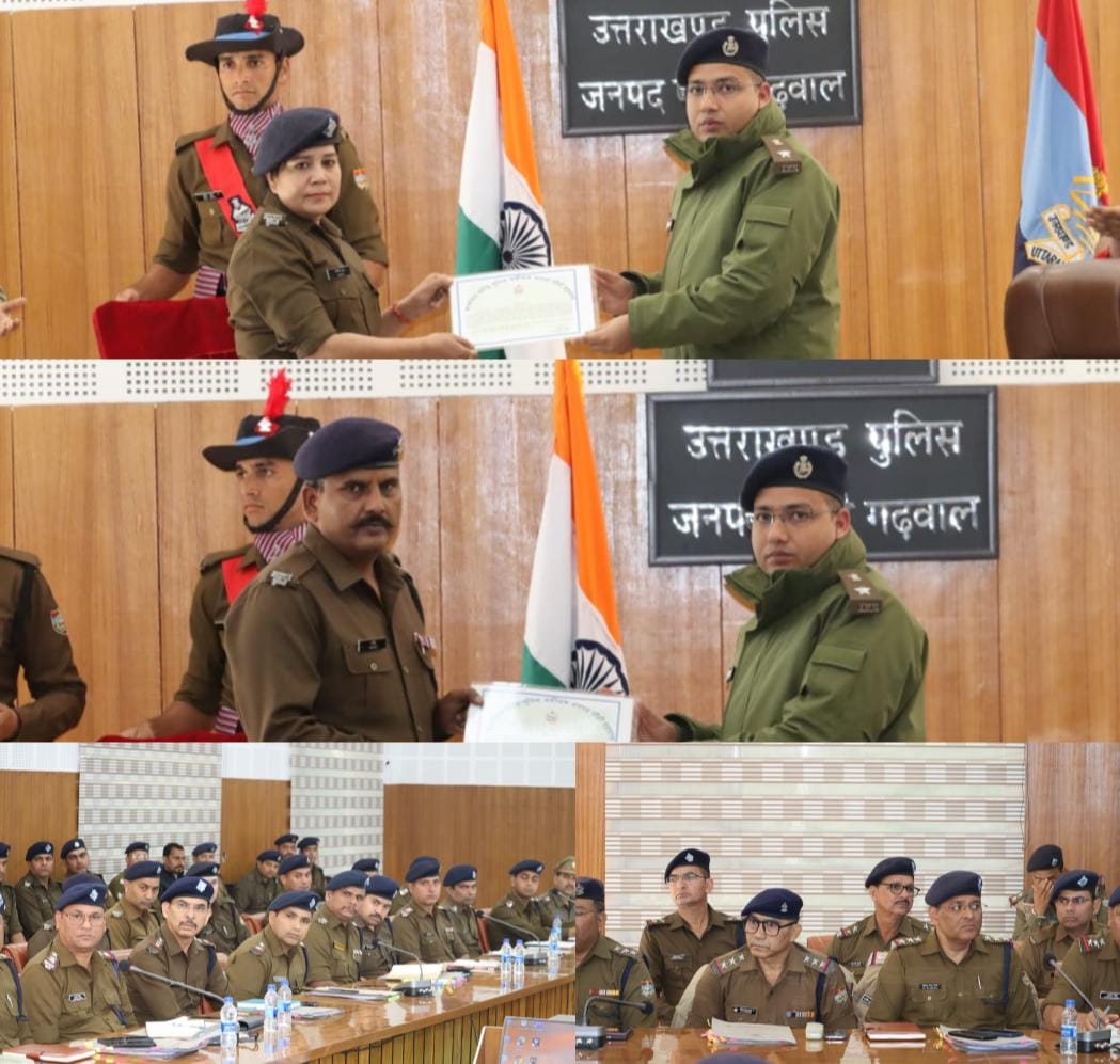 9. अक्टूबर माह में जनपद में उत्कृष्ट कार्य करने वाले 26 पुलिस कार्मिकों (उ0नि0 ना0पु0 विजय सैलानी, उ0नि0 ना0पु0 अनिल चौहान, उ0नि0 शशिभूषण, उ0नि0 पंकज कुमार, अपर उपनिरीक्षक संजय पुण्डीर, मुख्य आरक्षी महेन्द्र सिंह, मुख्य आरक्षी दिनेश चन्द, मुख्य आरक्षी वीर बहादुर, मुख्य आरक्षी संतोष कुमार, मुख्य आरक्षी राकेश बिष्ट, महिला आरक्षी बबीता, आरक्षी दीपक कुमार, आरक्षी आशीष बिष्ट, आरक्षी मुकेश, आरक्षी सूर्यकांत सैनी, आरक्षी हरीश लाल, आरक्षी महेन्द्र कन्याल, आरक्षी मनोज कुमार, आरक्षी राकेश कुमार, आरक्षी गौरव कुमार, आरक्षी चनद्रपाल, महिला आरक्षी अंकिता, महिला आरक्षी अंजुम आरा, महिला आरक्षी चन्दा,होमगार्ड जातबहादुर, होमगार्ड कमलेश) को वरिष्ठ पुलिस अधीक्षक पौड़ी श्री सर्वेश पंवार द्वारा प्रशस्ति पत्र प्रदान कर सम्मानित किया गया। साथ ही अन्य अधिकारी/कर्मचारियों को भी निर्देशित किया कि वे पूरी निष्ठा, ईमानदारी और सक्रियता के साथ अपने दायित्वों का निर्वहन करते हुए जनपद में शांति, सुरक्षा और कानून व्यवस्था को मजबूत बनाने हेतु पूर्ण मनोयोग से कार्य करें।