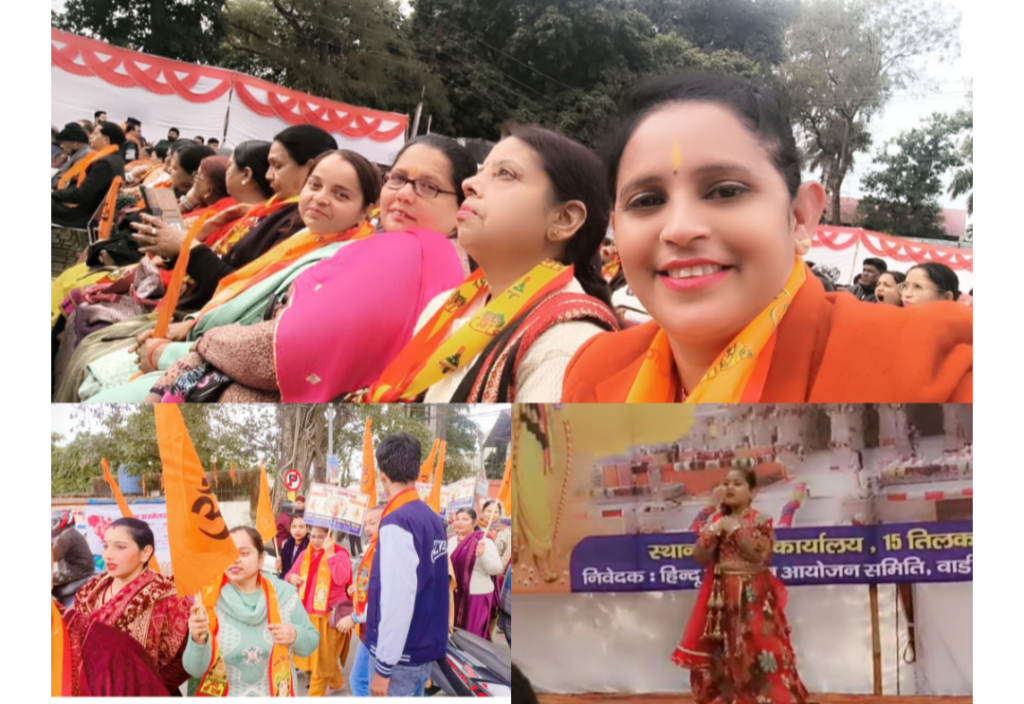 किया गया। वक्ताओं ने समाज को संगठित रहकर धर्म एवं राष्ट्रहित में कार्य करने का आह्वान किया इसके पश्चात हिंदू समाज से जुड़े कामगार वर्ग के प्रतिनिधियों—जैसे बढ़ई, दर्जी, प्लंबर, वेल्डर आदि—को प्रांत प्रचारक द्वारा सम्मानित किया गया। समाज सेवा में सक्रिय रामानंद ठाकुर को विशेष रूप से सम्मानित किया गया।सांस्कृतिक कार्यक्रमों के अंतर्गत परशुराम चतुर्थवेद विद्यालय के बच्चों ने देशभक्ति गीत एवं मंत्रोच्चारण की प्रस्तुति दी। साथ ही जुनून अकादमी की संचालिका अर्चना सिंगल के विद्यार्थियों ने राम जन्म एवं शिव-लीला पर सुंदर प्रस्तुति दी। कार्यक्रम का संचालन निकुंज गुप्ता ने किया।कार्यक्रम में प्रमुख रूप से उपस्थित रहे शैलेंद्र जी (प्रांत प्रमुख), राजकुमार तिवारी, पुनीत मित्तल, अनिल नंदा, डॉ. आदित्य कुमार, विश्वास डाबर, अर्चिता डाबर, राजकुमार शर्मा, संतोष जायसवाल, शुभ शुक्ला, आदेश चौहान, ऋषभ तिवारी, अनीता गर्ग, अनूप गोयल, नीतीश नंदा, गौरव बक्शी, पंकज मेसन, सत्येंद्र, राजकुमार शाह, राकेश सिंह, सुमित, मंजू कटारिया, डॉ. आनंद, अनिल डोरा, मनन, सिमरन सक्सेना अंशिता शर्मा आदि